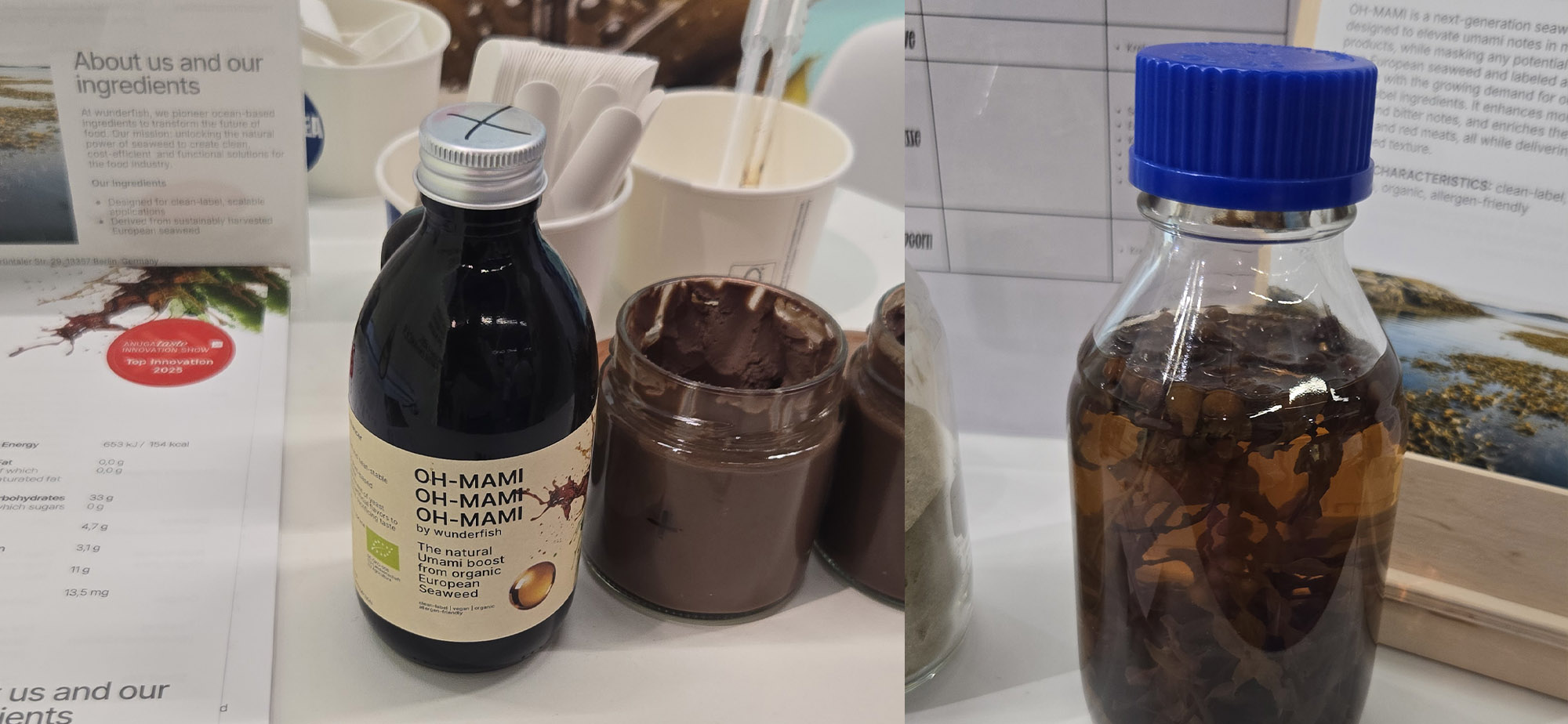 Ein Unternehmen, das inzwischen über Jahre erfolgreich die Schnittmenge zwischen Genuss und Nachhaltigkeit bespielt, ist „Wunderfish“ – aka „Bettafish“, aka „Oceanfruit“ –, die jetzt mit „Oh-mami“ ein Würzmittel auf Basis von Algen entwickelt haben, das einerseits Lebensmitteln, süß wie herzhaft, mehr Tiefe gibt, bei absoluter Zurückhaltung im Eigengeschmack. „Dies bietet gleichzeitig die Möglichkeit, Zutaten wie Zucker oder Kakao zu reduzieren“, erklärte Produktentwickler Thorsten Behnk. Letzteres könnte für Lebensmittelproduzenten in Anbetracht der Preisentwicklung interessant werden. Dafür gab es die Aufnahme in die Top Ten der Anuga.