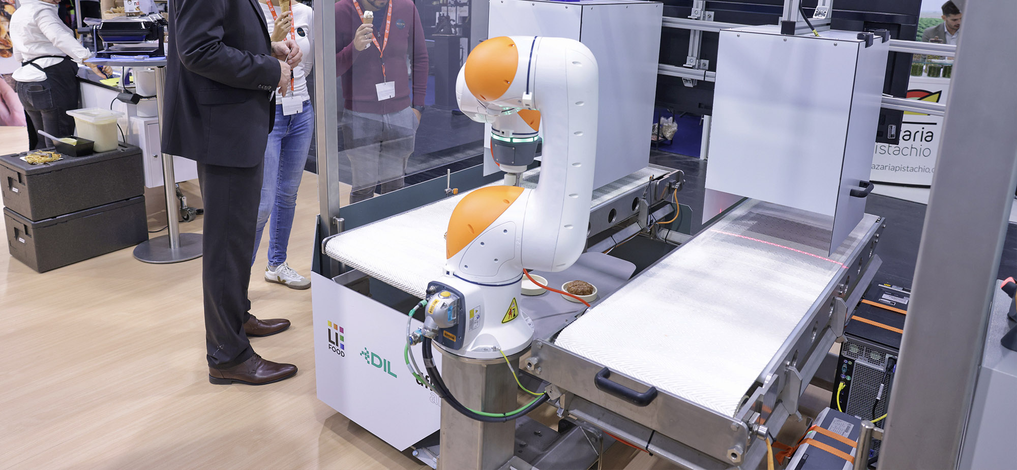 Am Stand des Anuga-Partners, der Bundesvereinigung der Deutschen Ernährungsindustrie, gab es nicht nur köstliche Waffeln, sondern auch einen etwas gemächlichen Roboterarm vom Deutschen Institut für Lebensmitteltechnik in Kooperation mit dem Deutschen Forschungszentrum für Künstliche Intelligenz GmbH. Dieser präsentierte eindrucksvoll, wie künstliche Intelligenz Anwendung in der lebensmittelproduzierenden Industrie findet. Dafür hob er zwei Kunststofffrikadellen, analysierte diese visuell und hob sie dann mit einem besonders raffinierten, auf dem Kamineffekt beruhenden Sog von einem Fließband in eine Schale – und vice versa. Im Video konnte man dessen praktische Anwendung bei zu verarbeitendem Gemüse sehen, das Verformungen und qualitative Mängel bei Ware zweiter und dritter Wahl feststellte. Der Geschäftsführer Christian Kircher fügte hinzu: „Künstliche Intelligenz ist in der Lage, den Reifegrad von Avocados akustisch auf rüttelnden Fließbändern festzustellen.“ Eine Infografik verdeutlichte, wie KI Effizienz steigern, Prozesse optimieren, Lebensmittelverluste reduzieren und die Qualität verbessern kann. Zugleich gibt es eben auch bestehende Hürden: rechtliche Unsicherheiten, Datenqualität, fehlendes Know-how und hohe Investitionskosten.