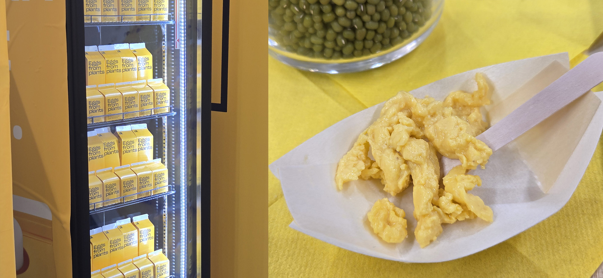 Das amerikanische Unternehmen „Just“ bot auf der Messe eine pflanzliche Alternative für Rührei, Omelette, Pfannkuchen und Co. an – fernab jeglicher Experimente mit Tofu, dafür auf Basis von Mungobohnen. Sie sehen sich als pflanzliche Alternative für Frühstücksbuffets in Hotels. Und nicht zu vergessen: ohne Cholesterin ist es auch eine schöne Gelegenheit für Eiergenuss in Krankenhäusern und Altersheimen.