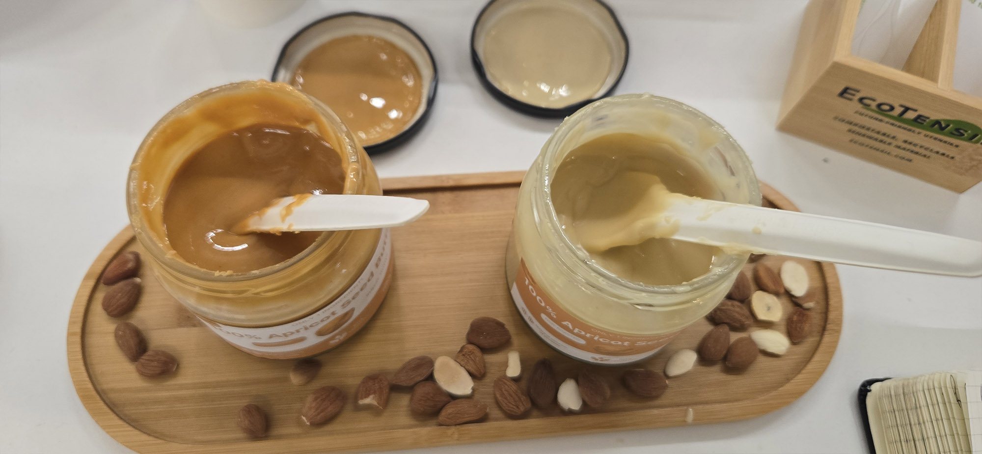 Ein anderes Unternehmen, das mit einem Alternativprodukt aufwartet, ist die „Kern Tec GmbH“ aus Wien mit ihrer Aprikosenkernbutter. Marillenkerne sind dort ein Abfallprodukt, das höchstens Einsatz als Persipan findet, im Zweifelsfall aber einfach verfeuert wird. Die Herausforderung ist der Cyanidgehalt, der mittels patentierten Verfahrens reduziert wird. Auf der Anuga präsentierte das Unternehmen die pur schon ausgesprochen köstliche, fruchtige Creme als pikanten pflanzlichen Aufstrich als Frischkäsealternative sowie als Aprikosenmandelbruch in Schokolade – verdienter Top-Ten-Kandidat.