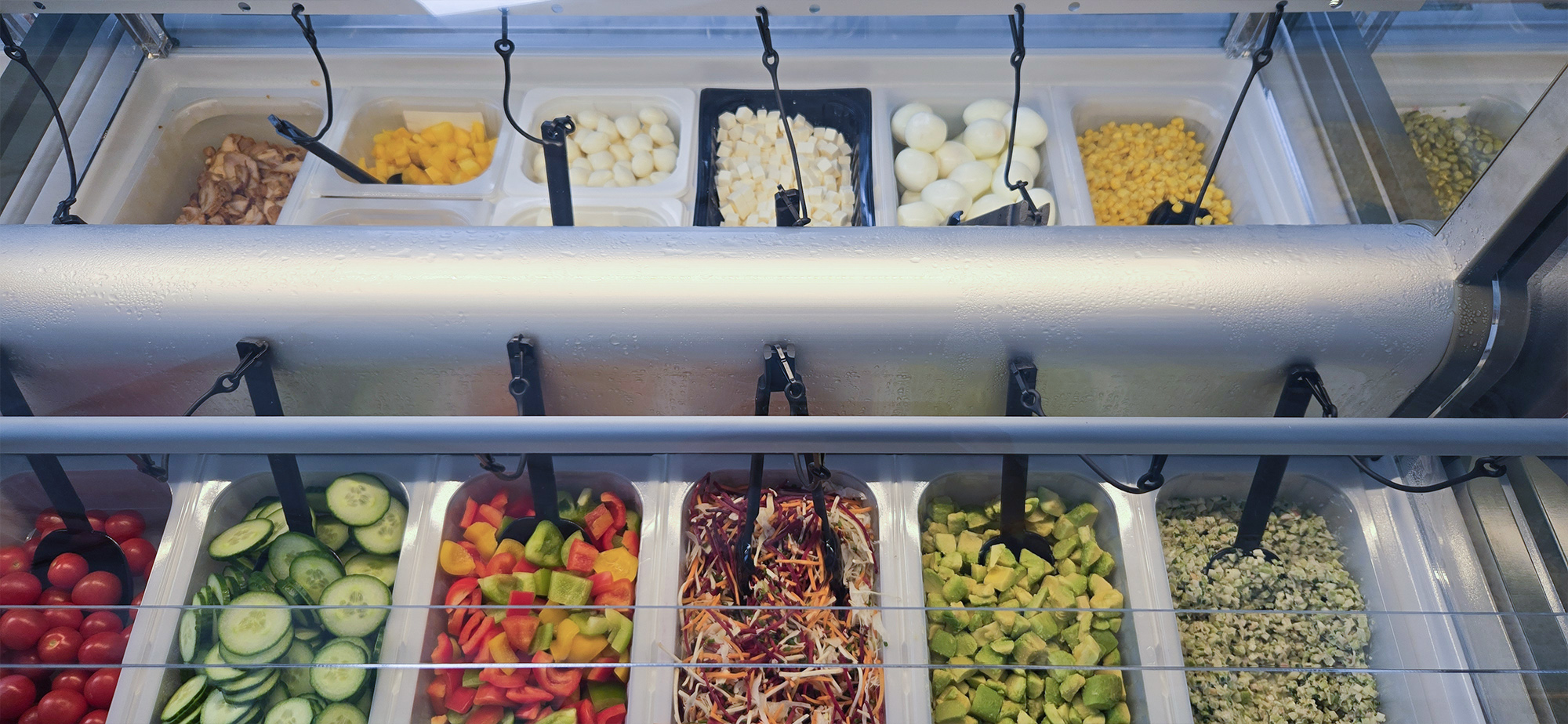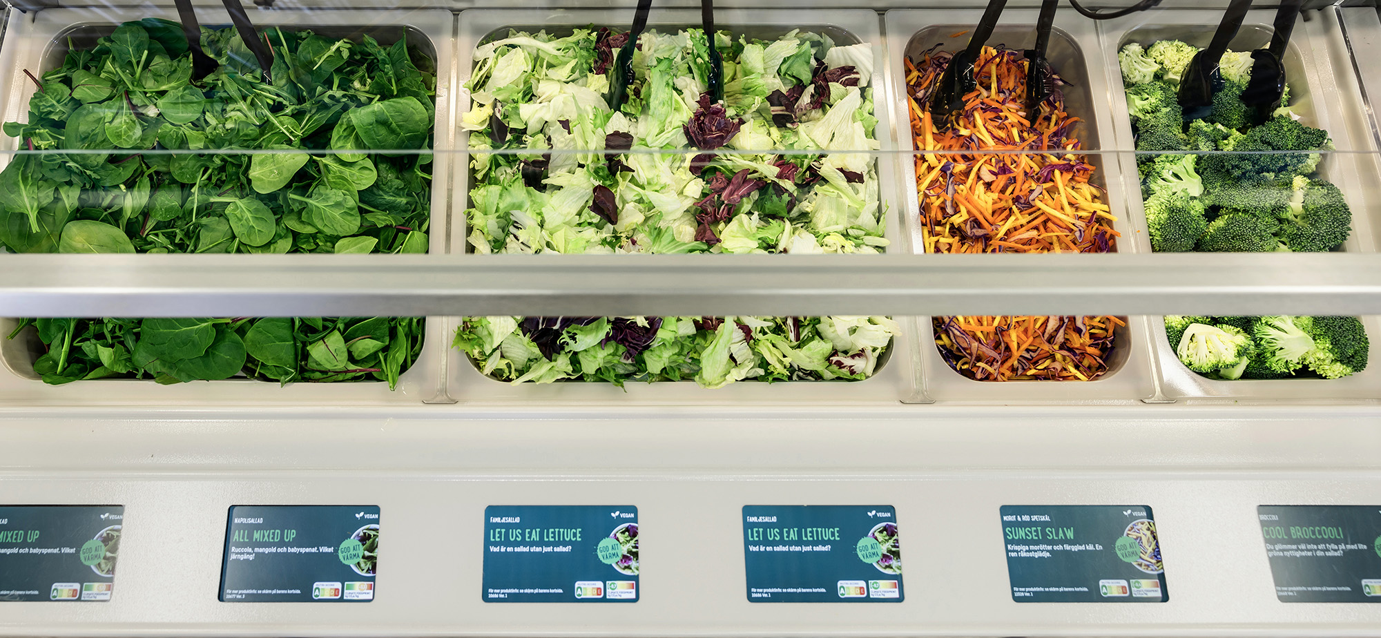 „Pasta trifft Chili“, „Brokkolicieuse“ oder „Curry köstlich“ – die Namen der Gerichte machen bereits Lust auf mehr. Neben jedem Salat finden sich Nutri-Score, Allergene, Angaben zu veganen Optionen und der CO₂-Fußabdruck. Wer es übersichtlicher mag, kann alle Informationen auf einem zentralen Bildschirm abrufen. Am Display kann man sich auch Empfehlungen für die persönliche Salatzusammenstellung geben lassen, etwa besonders proteinreiche, pflanzliche Kombinationen für Sportlerinnen und Sportler oder Varianten mit möglichst geringem CO₂-Fußabdruck. Die künstliche Intelligenz analysiert dafür das aktuelle Angebot und schlägt passende Zutaten vor, die sich direkt am Buffet zusammenstellen lassen.