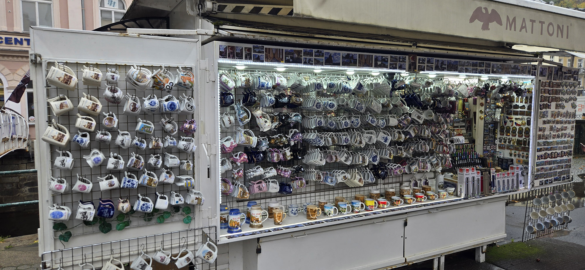 Nahezu unverzichtbar erweisen sich beim Prozedere jene Porzellantrinkbecher mit integriertem Trinkhalm im Henkel, die es in mannigfaltigen Varianten und Dekoren, oftmals herrlich kitschig, an allen Ecken und Enden der Stadt in Büdchen und Souvenirshops käuflich zu erwerben gibt. Man befüllt sein Miniaturkännchen an den unablässig-sprudelnden Quellen und trinkt dann langsam aus der Tülle das warme Wasser Schlückchen für Schlückchen. Abgesehen von der Temperatur unterscheiden sich die Quellen auch durchaus geschmacklich, vom leichten eigentümlichen Nachgeschmack bis hin zur stark mineralisch schon eingetrübten Variante, gibt es auch einige Quellen deren Wasser dank natürlicher Kohlendioxidvorkommen prickelt. Teilweise liegen diese Quellen nur wenige Meter auseinander. Drei Millionen Liter Heilwasser dringen so tagtäglich an die Erdoberfläche mit insgesamt 18 Tonnen Mineralsalzen.