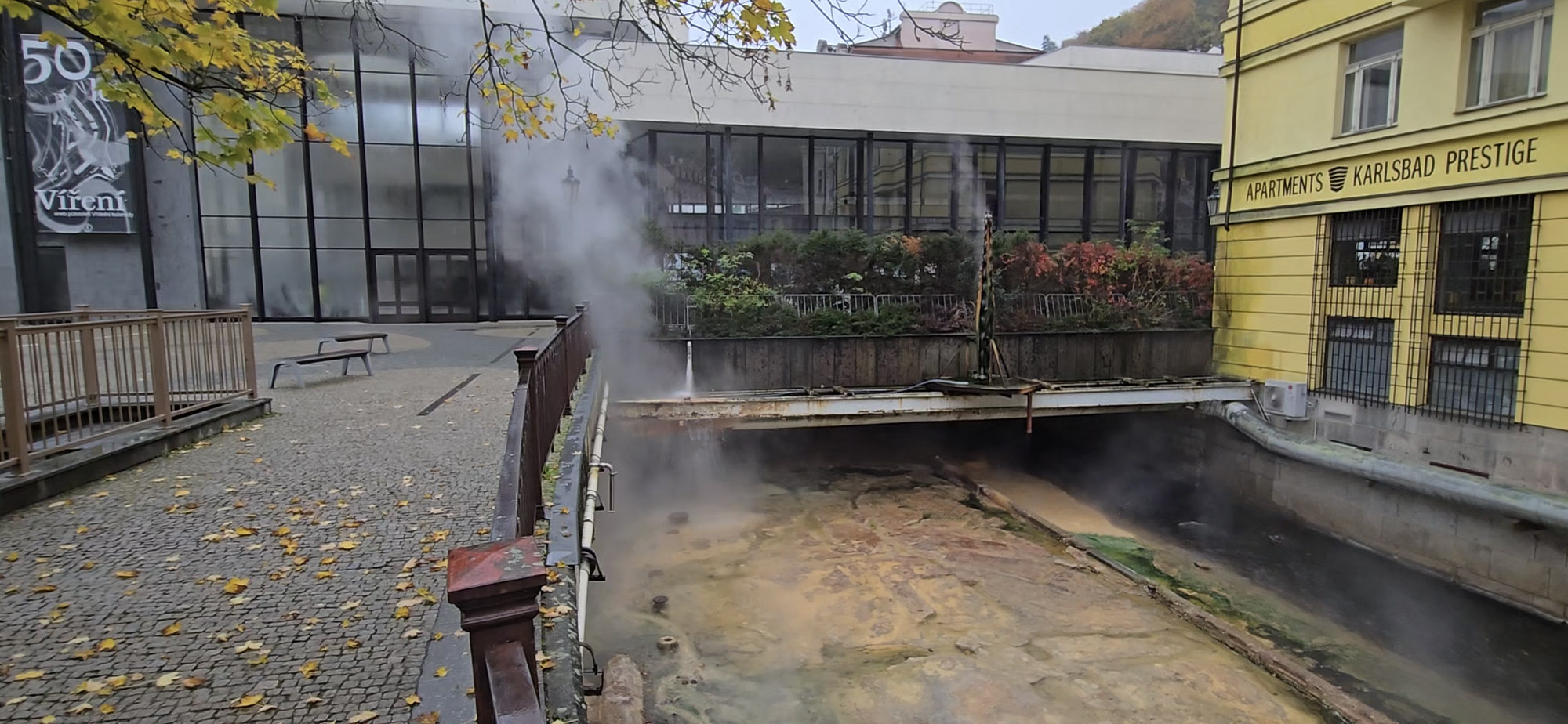 Über allem steht die moderne Vřídelní kolonáda aus Glas und Beton, die den 73 Grad heißen Sprudel umschließt – den mächtigsten und bekanntesten Geysir der Stadt. Hier schießt das Wasser mit einer Temperatur von 72 °C und einer Höhe von bis zu 12 Metern aus der Tiefe, pulsierend, dampfend, vor allem imposant. Besucherinnen und Besucher versammeln sich davor wie vor einem Altar. Der Schwefelgeruch liegt in der Luft, Dampf zieht durch das Glasdach, Tropfen glitzern im Licht.
