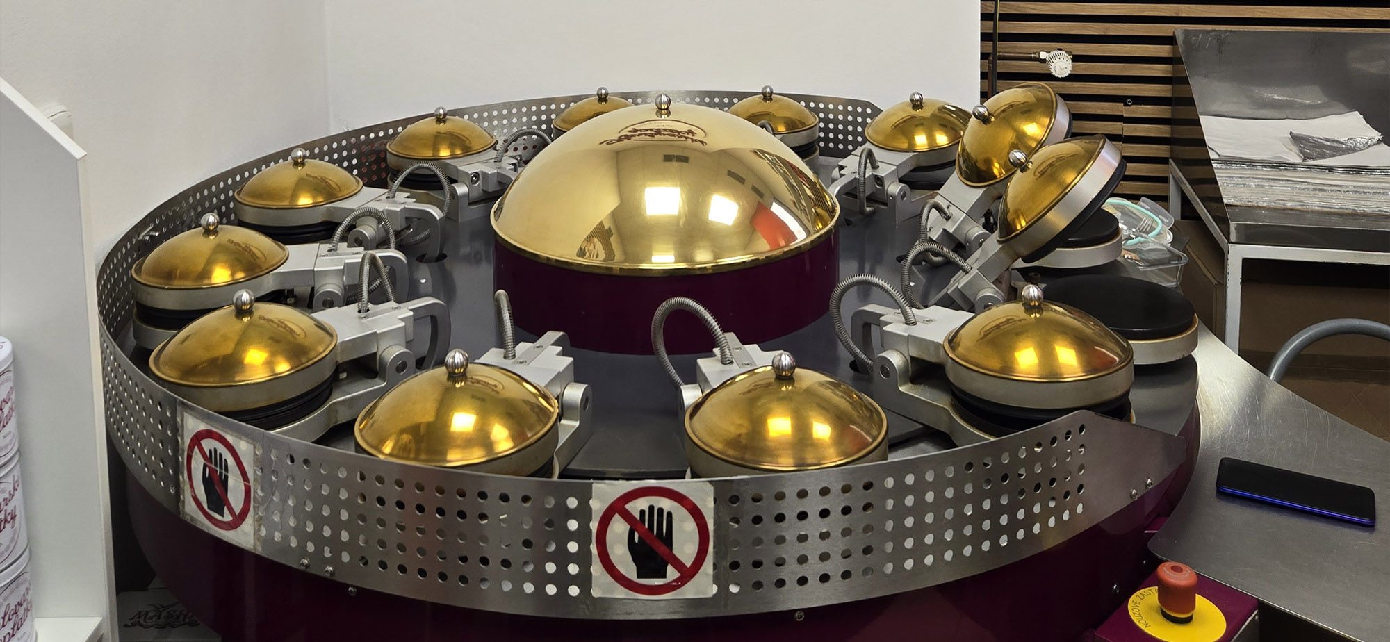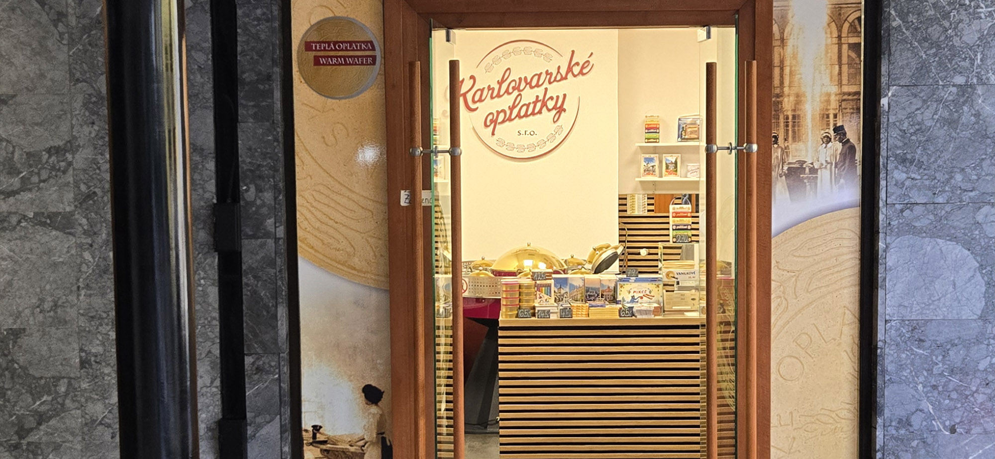 In vielen Schaufenstern der Waffelgeschäfte von Karlovarske Oplatky sehen die Besucherinnen und Besucher oft karussellförmig angeordnete Waffeleisen, in denen die vorgebackenen Oblaten für den spontanen Verzehr nochmal im Eisen aufgebacken werden, bis sie extra knusprig sind und duften.
