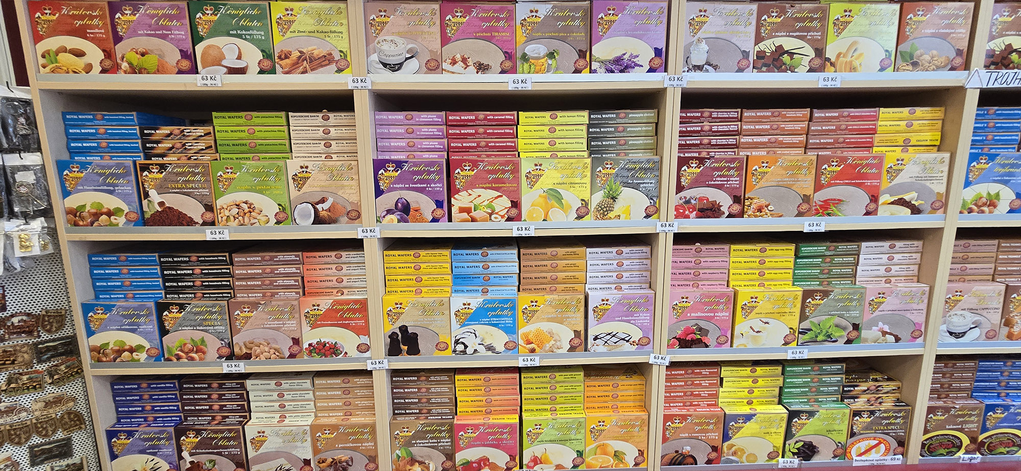 Was früher in Küchen von Kurpensionshäusern und Backstuben hinter Schaufenstern entstand, wird heute in spezialisierten Betrieben hergestellt, deren Produktionsweise sich in wesentlichen Zügen seit dem 19. Jahrhundert kaum verändert hat. Die klassische Karlsbader Oblate besteht aus wenigen, sorgfältig ausgewählten Zutaten: Mehl, Butter, Zucker, Milch, Nüsse oder Kakao und – typisch für die Region – Thermalwasser aus Karlovy Vary, das einen Teil der Flüssigkeit im Teig ersetzt. Dieses Mineralwasser verleiht der Oblate eine dezente, leicht würzige Note und macht sie unverwechselbar. Der Teig wird dünn ausgerollt, zwischen zwei Platten ausgebacken und anschließend gefüllt. Die feinen Ornamente auf den Platten sind seit dem 19. Jahrhundert weitgehend unverändert und dokumentieren die handwerkliche Tradition. Die Füllung besteht klassisch aus Zucker, Mandeln oder Haselnuss, heute zunehmend auch mit Variationen wie Kakao, Vanille oder moderneren Geschmacksrichtungen wie Dubai-Schokolade.