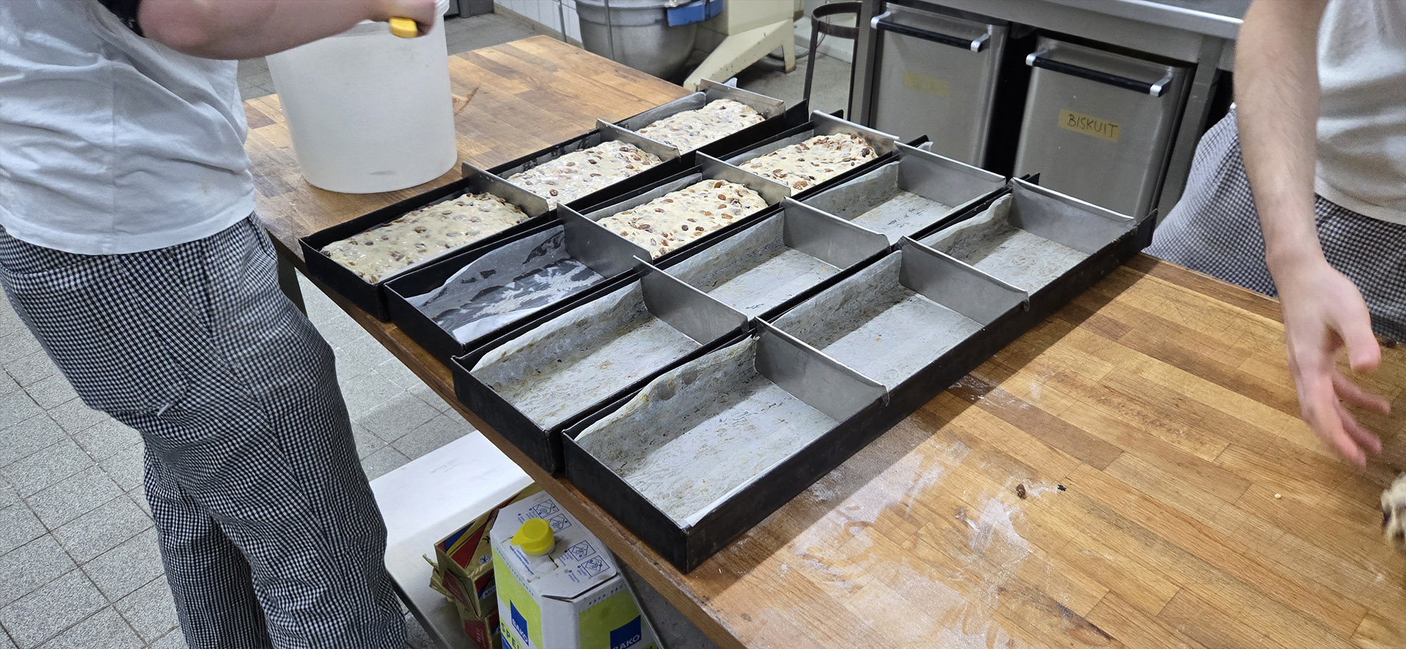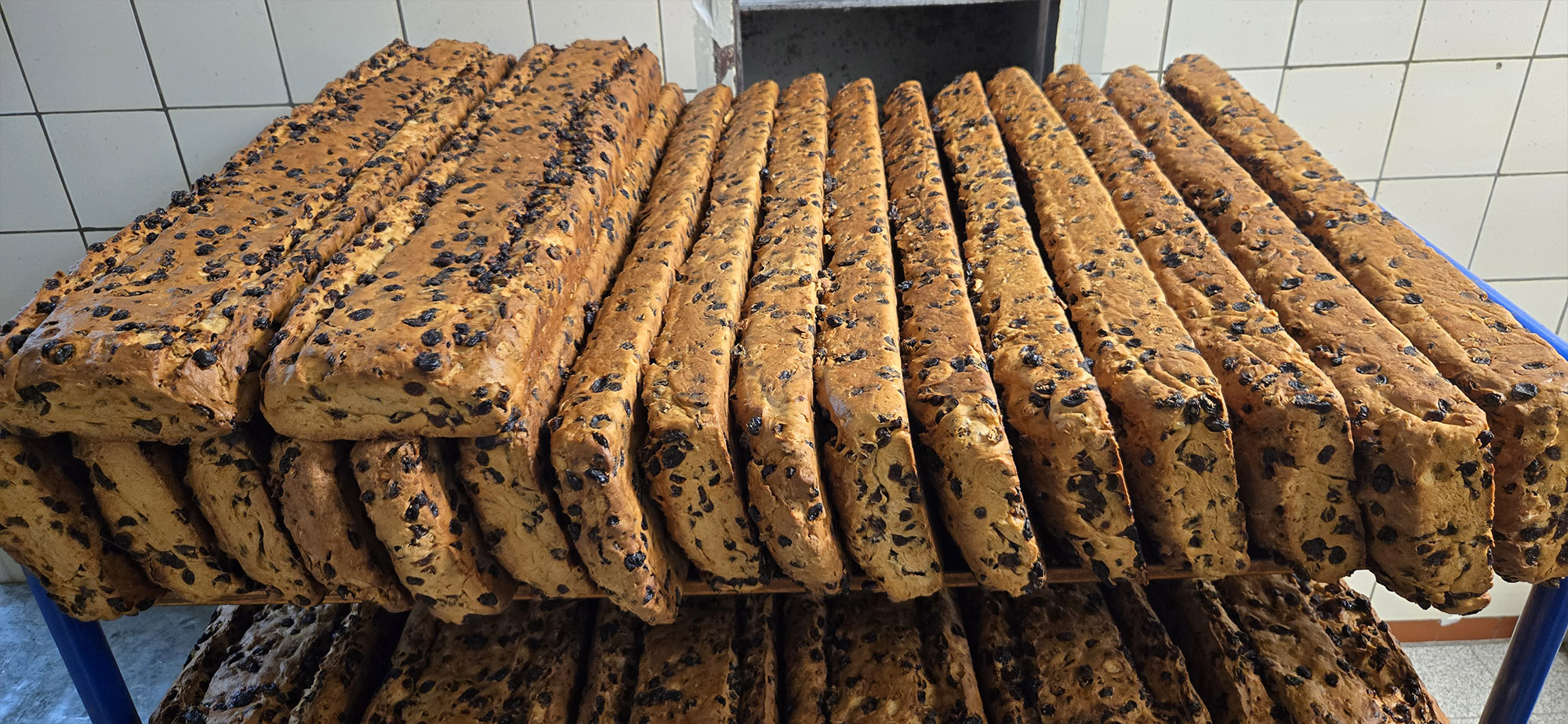 Die Grundlage bildet ein Hefeteig, angereichert mit Butter, Zucker und Gewürzen wie Kardamom, Vanille und Zitronenschale. Er ist gehaltvoll, aber im Vergleich zum Christstollen mit einer moderateren Buttermenge. Nach dem Vorteig werden die Grundzutaten miteinander verknetet. Die großen Mengen „Buntes“ – Sultaninen, Orangeat und Zitronat sowie gehackte Mandeln – werden zum Schluss kurz und vorsichtig untergearbeitet. „Damit sich der Teig nicht grau färbt“, erklärt der Konditormeister. Der Teig bekommt keine lange Zeit zum Gehen, ist dafür aber nach der Zubereitung etwas elastischer.