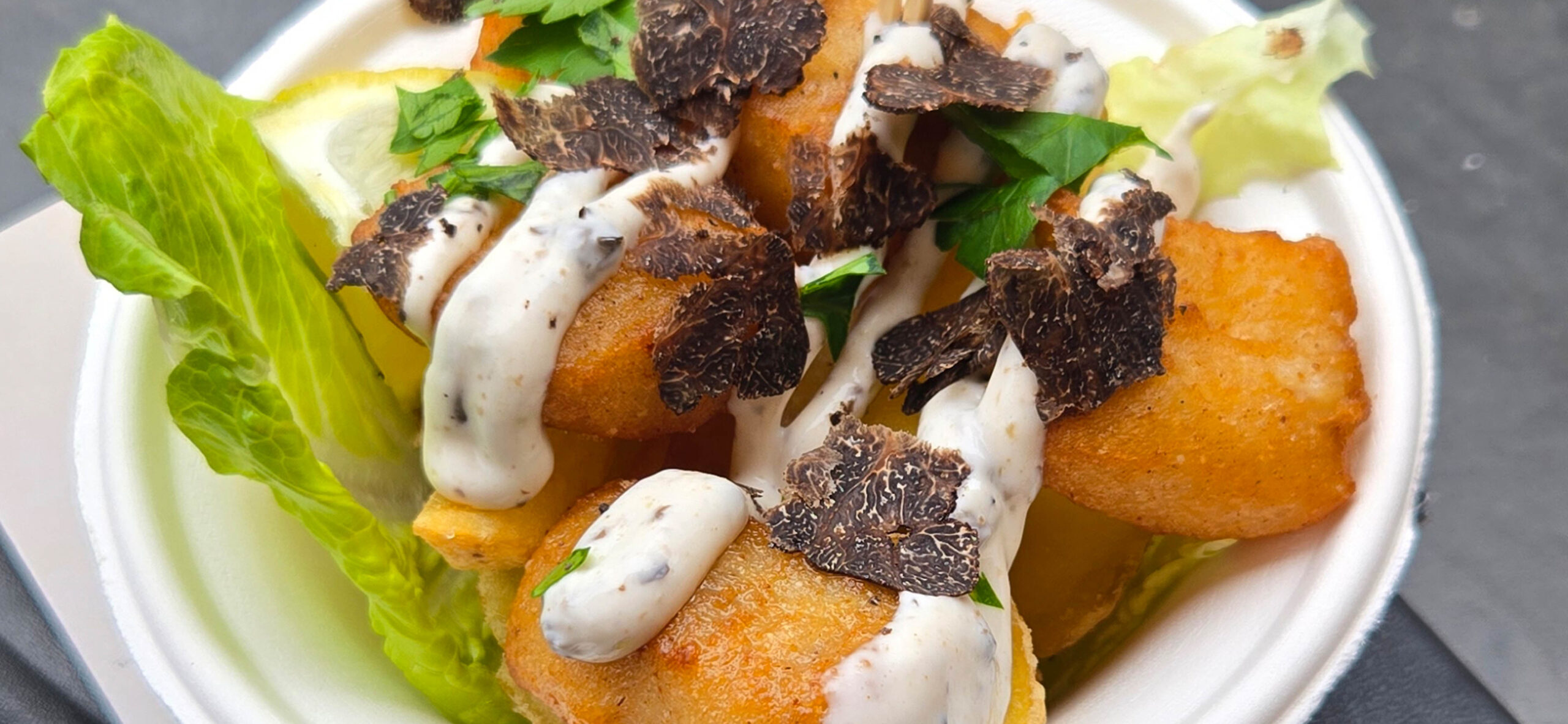 Der Soulty Food Club präsentierte Fish ‘n Chips mit Trüffelmayonnaise und großzügig gehobeltem Trüffel. Während Pommes Frites mit Trüffelmayonnaise und Parmigiano Reggiano, am besten mit einem Glas Champagner, äußerst gut harmonieren, konkurrierte die deftige Fischpanade mit dem erdigen Aroma. Denn auch Fisch, beispielsweise gedünsteter Kabeljau, funktioniert mit dem Pilz, allerdings zurückhaltender dosiert, an und für sich super. Vielleicht hätte ein ordentlicher Klecks Yuzu-Marmelade als spannende Zitrusnote und nur ein Bruchteil des Trüffels in der Mayonnaise aus dem Gericht eine absolute Deluxe-Variante gemacht.