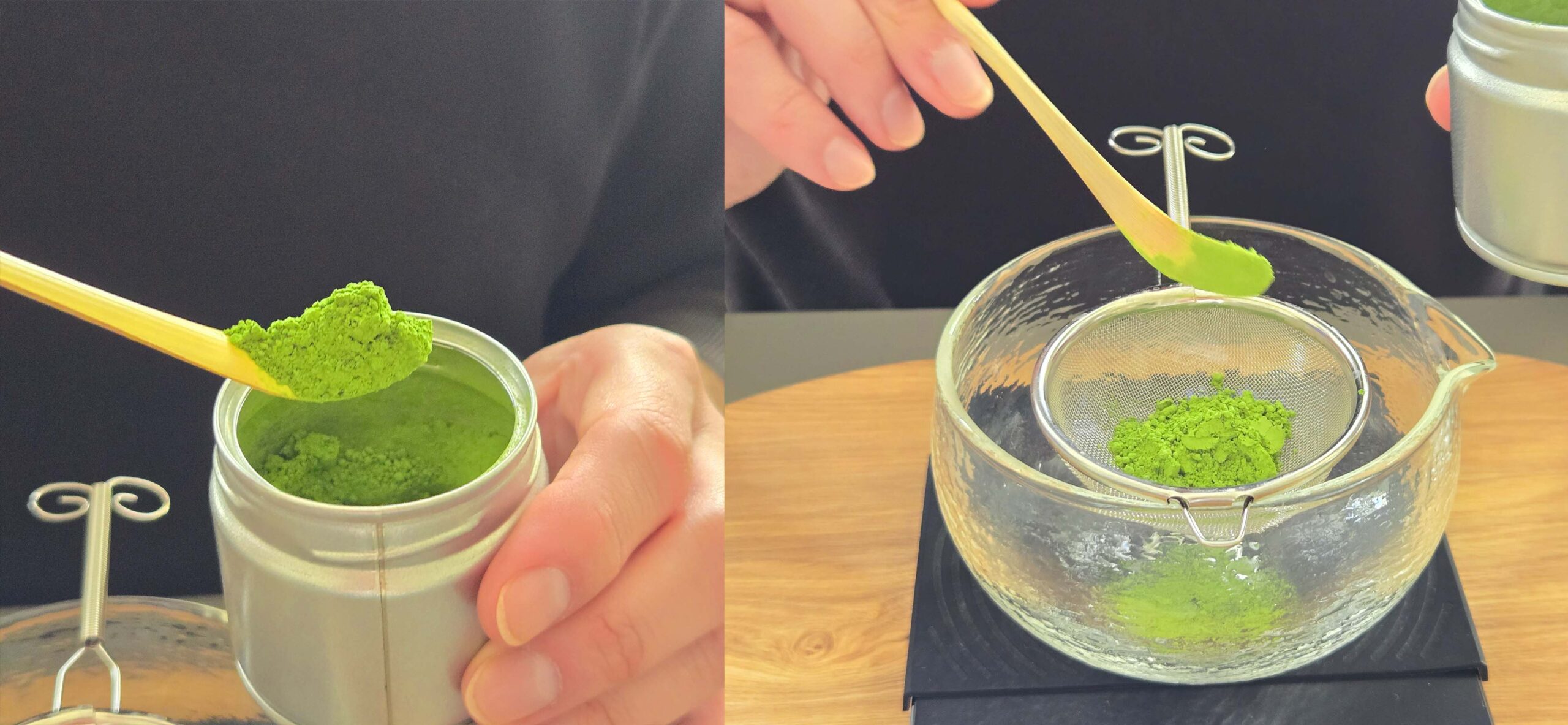 Eduardo wiegt eine bestimmte Menge Matcha ab und siebt das Pulver in eine Schale. Zuerst kommt ein kleiner Schluck etwa 70 Grad heißes, gefiltertes Wasser dazu, der zunächst zu einer sattgrünen Paste verrührt wird.