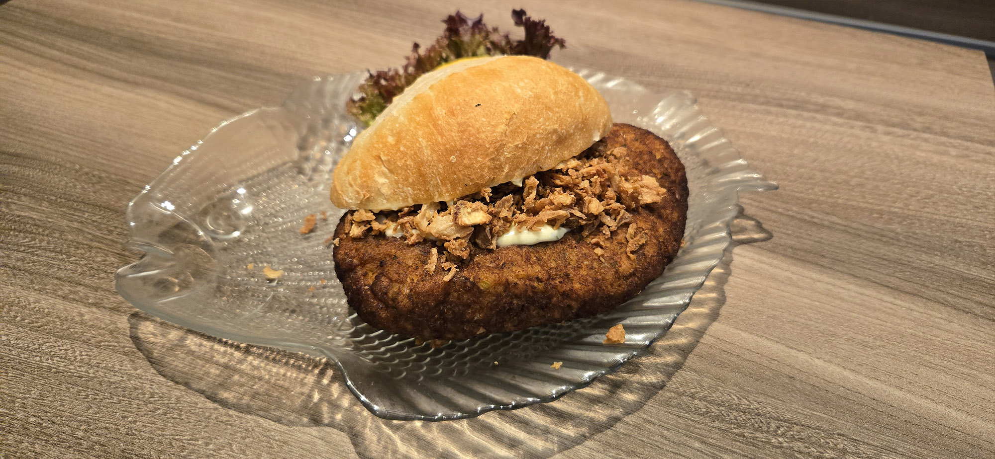 Zur Überraschung serviert der Koch zwei Fischfrikadellen, denn seit geraumer Zeit trendet der Bremer mit selbst gemachter Remoulade, wie man es ansonsten vielleicht vom Backfisch kennt, der mit seinen Zwiebel- und Gurkenstückchen fein säuerlich-kräuterig hervorragend schmeckt. Klassisch wird die Fischfrikadelle aber mit Ketchup und Röstzwiebeln serviert. Was möglicherweise banal klingt, funktioniert subjektiv betrachtet aber noch ein bisschen besser: Der Ketchup mit seiner fruchtig-süßen Note und die Röstzwiebeln, die nicht nur umami, sondern auch schönen Crunch geben, verleihen dem Snack rundherum mehr Tiefe.