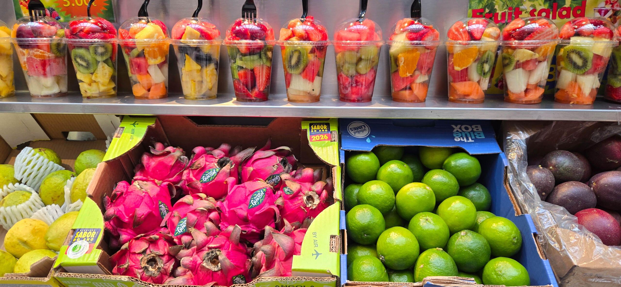 Um die Ecke des Hotels liegt der Mercado do Bolhao. Fruchtsäfte erstrahlen von unten angeleuchtet in mystischen Farben. Das darunter liegende Obst stammt in seiner Vielfalt aus Portugal oder dem Nachbarland Spanien, darunter auch in Deutschland so exotische Früchte wie Ananas, Maracuja oder die pinke Drachenfrucht stammen beispielsweise von den Azoren, die auch zu Portugal gehören.