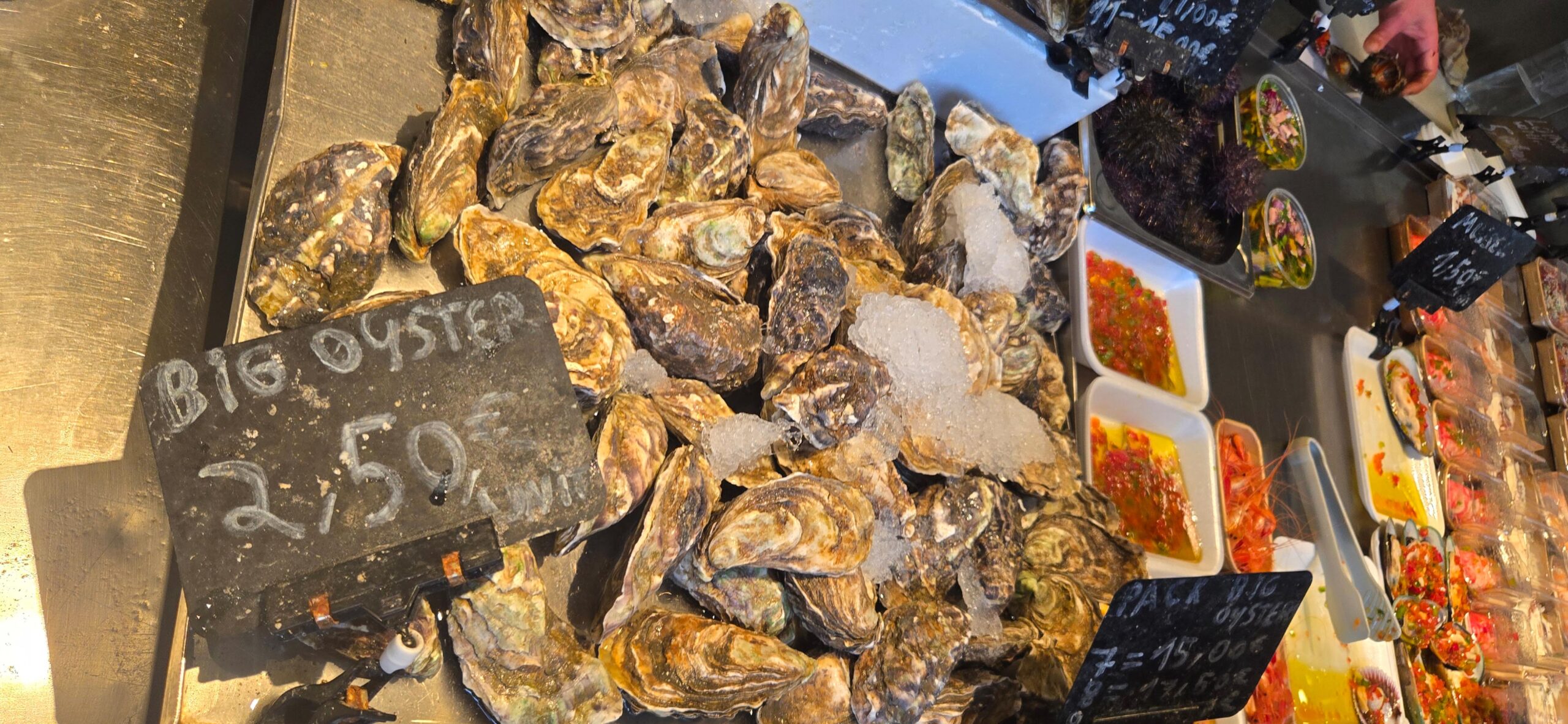 In einer anderen Ecke der Markthalle warten Meeresfrüchte in Hülle und Fülle in der Auslage, direkt vor Ort verkostet zu werden. Für diejenigen, die ein bisschen nachhelfen müssen, stehen Zitrone, Chilisauce, Essig und Gewürze bereit, um den Geschmack individuell abzurunden oder gegebenenfalls zu übertünchen. Auf Nachfrage bestätigt der Händler des Stands die portugiesische Herkunft der Austern.