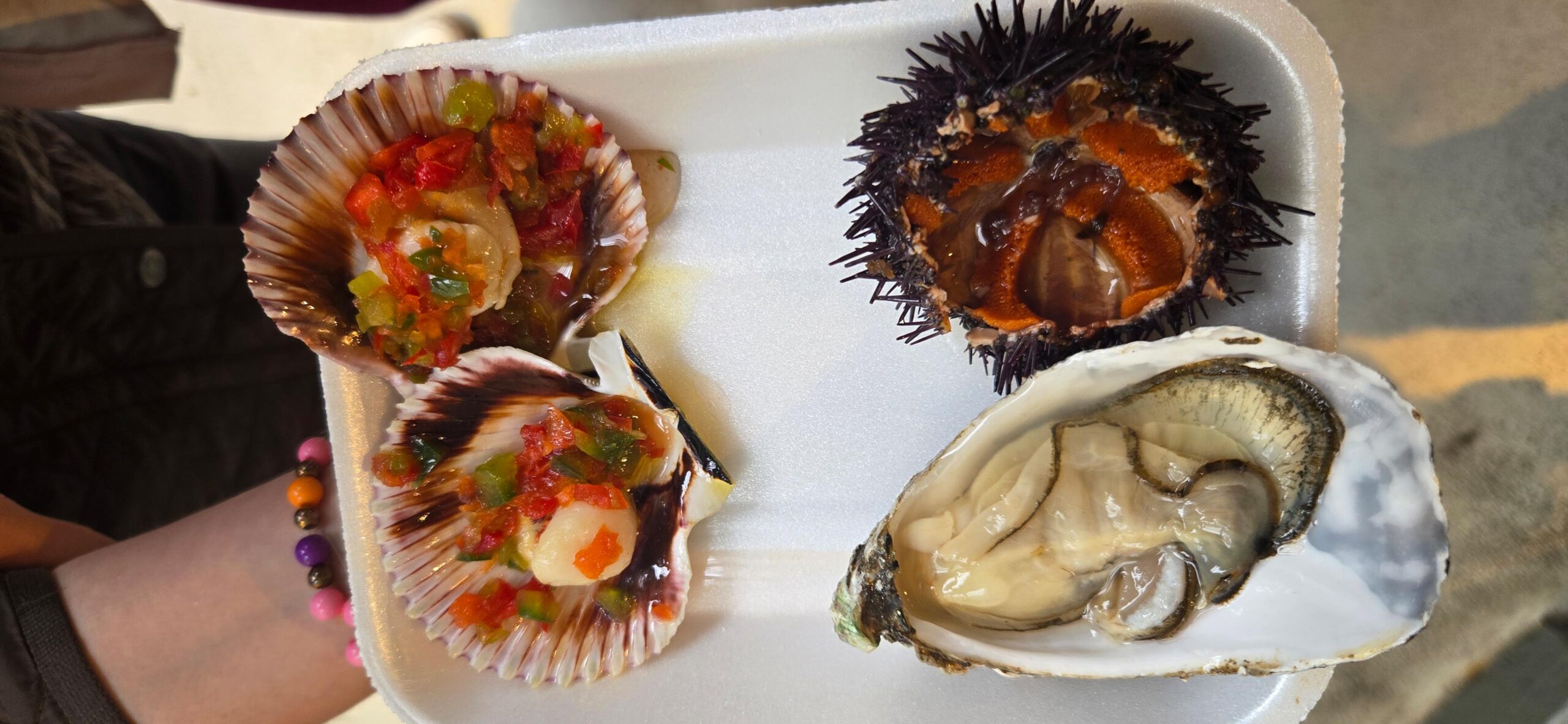 Er bietet sie in zwei Qualitäten an. Die großen Austern sind etwas salziger und stammen direkt nördlich von Porto von der Mündung des Rio Lima, die kleinen von der Algarve sind harmonischer und für den Einstieg besser geeignet. Für Genießer empfiehlt er die großen. Ohne großen Aufwand und Schutzhandschuhe öffnet der Händler die Austern innerhalb weniger Sekunden, das sehr salzige Austernwasser, das immer noch Verunreinigungen wie etwa Schalensplitter beinhalten könnte, kippt er weg. Auch den Seeigel schneidet er auf und reinigt ihn unter fließendem Wasser von kleinen Steinchen, bis nur noch der begehrte orange leuchtende Rogen übrig bleibt. Die rohen Jakobsmuscheln sind in Portugal etwas kleiner als etwa die bretonischen, sie werden mit einer Paprika Salsa angemacht verkauft, aber ehrlicherweise hätte der süß-nussige Geschmack diese nicht benötigt.