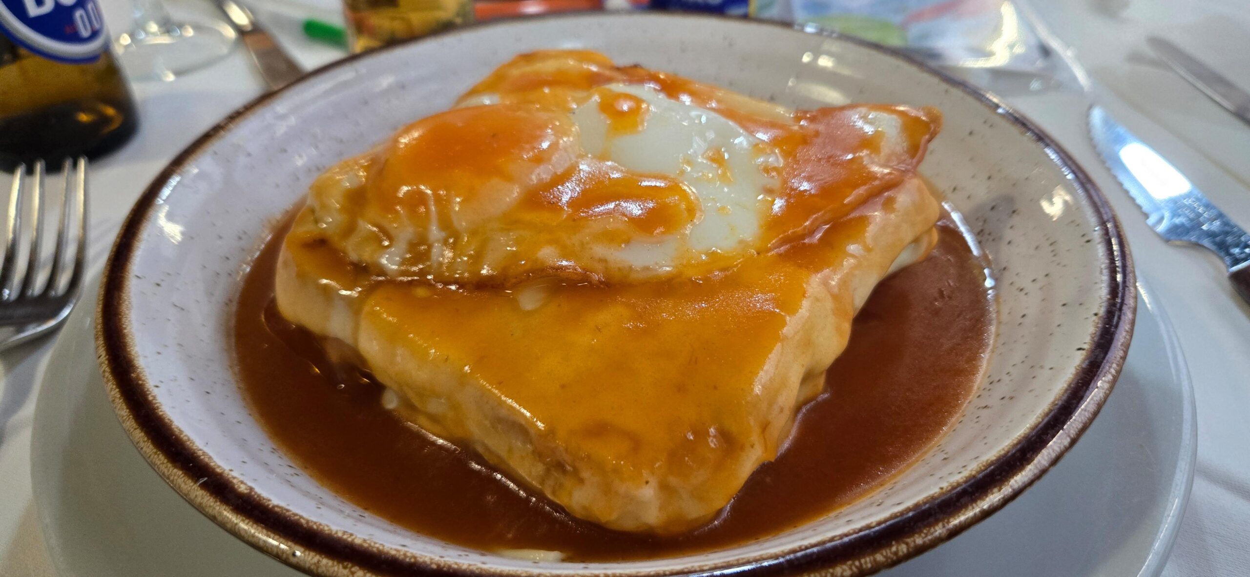 Bei der Francesinha, der kleinen Französin, handelt es sich um eine omnipräsente, in wirklich jedem Restaurant erhältliche Variante des internationalen Croque Monsieur. Das Gericht ist ein Schichtwerk aus Toastbrot, Steak, Schinken und verschiedenen Würsten wie der würzigen Linguiça, die komplett mit Käse überbacken wird. Das Ganze schwimmt in einer Sauce aus Bier, Tomaten, Chili und einem Schuss Portwein, die sich hervorragend mit Fritten aufsaugen lässt. Der Erfinder war in den 50er Jahren der Koch Daniel David Silva, der dabei an die Frauen in Frankreich dachte, anscheinend ziemlich spicy.