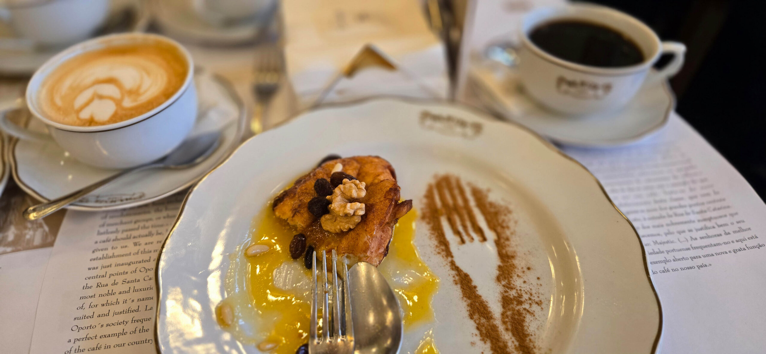 Als typische süße Nachspeise aus Porto gibt es die Rabanadas im Café Majestic: goldbraun ausgebackene Brotscheiben, veredelt mit Eiercreme, Pinienkernen, Walnüssen und Rosinen. Was bei den köstlichen, aber vollkommen überteuerten „Armen Rittern“ zwischen den ganzen Touristen tröstet, ist einerseits das edle Belle Époque Ambiente und andererseits die Vorstellung, wie die Schriftstellerin J. K. Rowling als Englischlehrerin in Porto regelmäßig hier im Café Majestic gesessen haben soll und angeblich sogar den Beginn des ersten Harry Potter hier auf eine Serviette geschrieben haben soll – magisch.